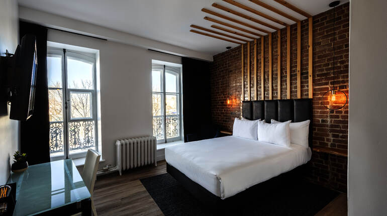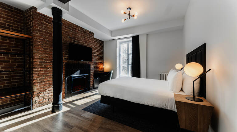 Ces superbes chambres avec lit Queen ont été rénovées au printemps 2020. Modernes, spacieuses et comfortables, elles sont absoluement parfaites pour un séjour en amoureux! Certaines de nos chambres deluxe possèdent un mur de briques d'origine et un plancher hypoallergénique (sans tapis). On y trouve notamment un bureau de travail ainsi qu'une salle de bain privée d'une grande douche vitrée. Au 1er étage.