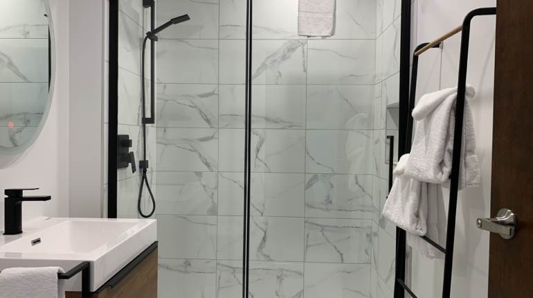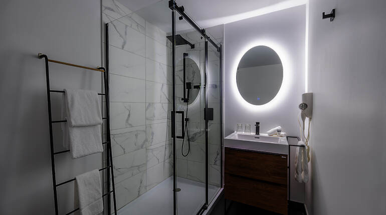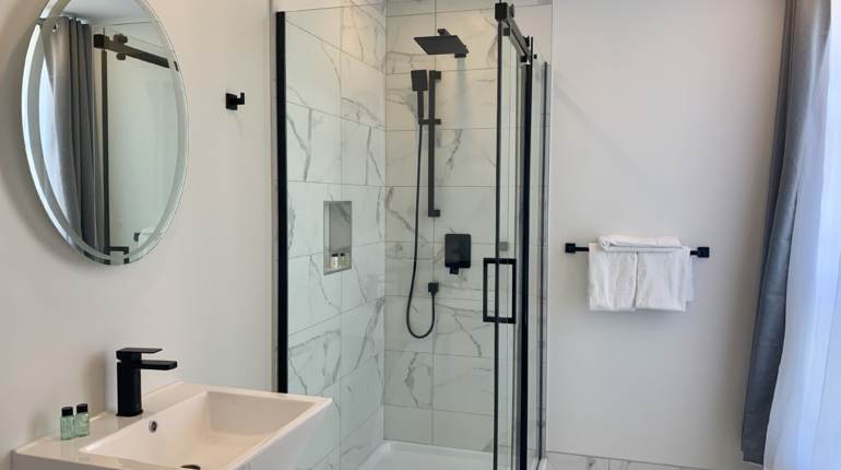 Chaque chambre est équipée d'une salle de bain privée: avec douche vitrée ou avec un combo baignoire et douche